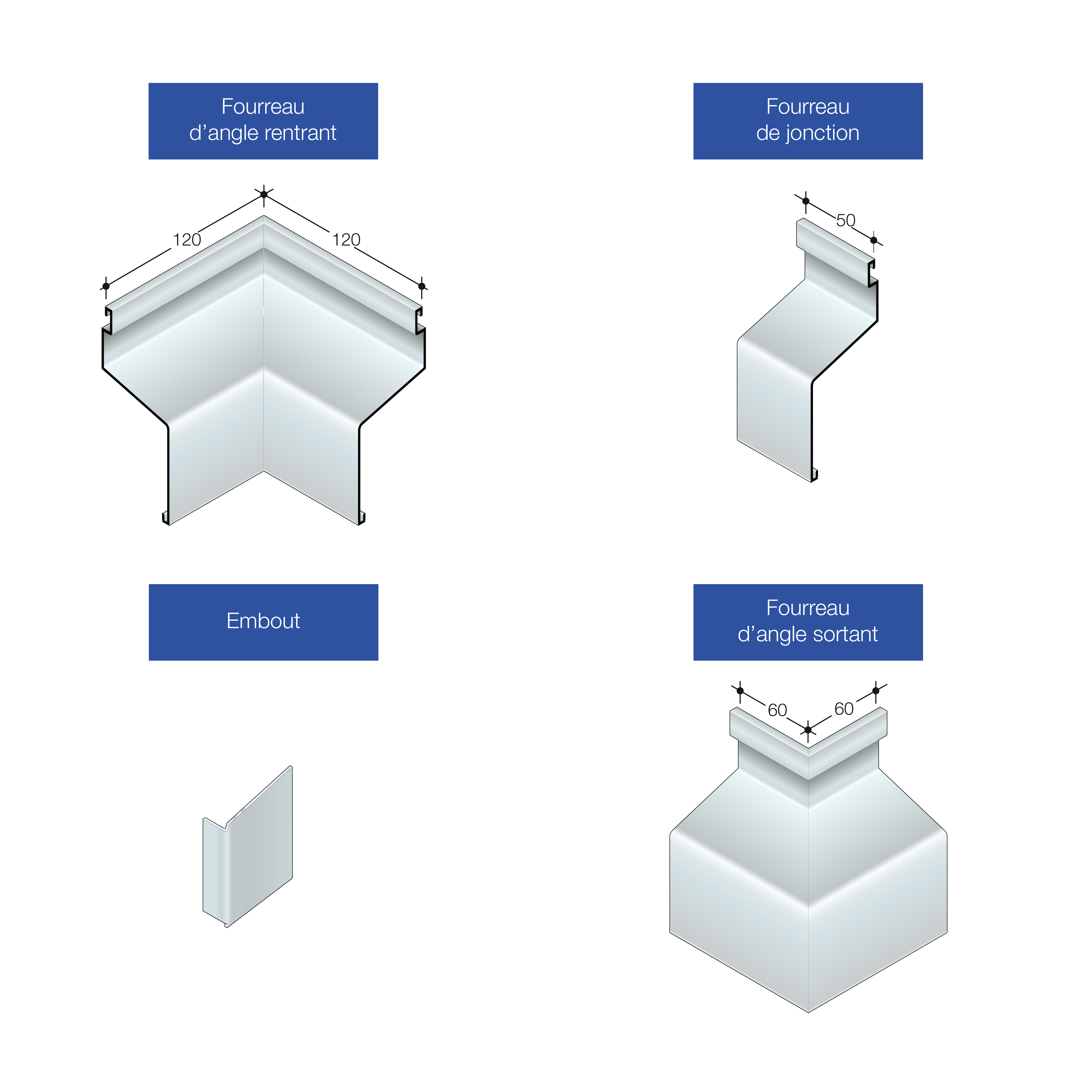External and Internal angle sleeve, Junction sleeve, End piece, Aluminium protection